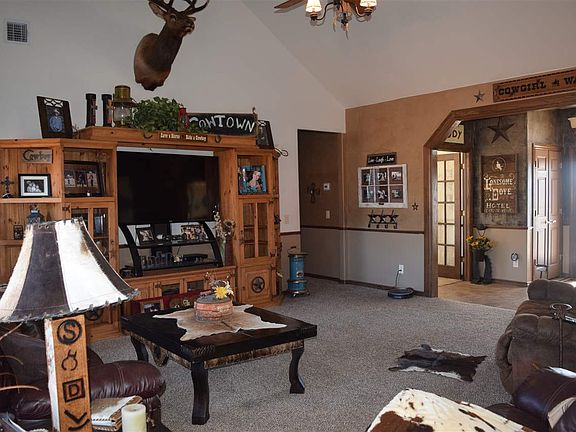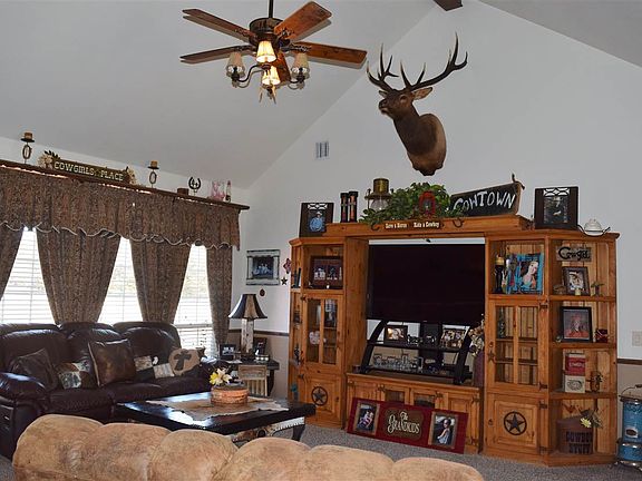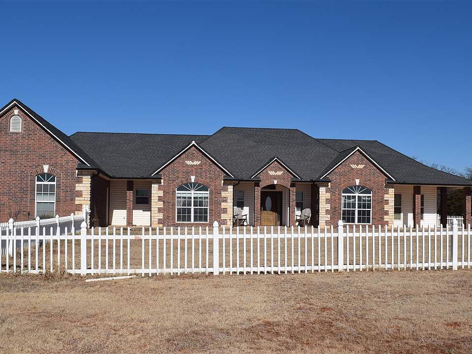 Magnificent Home on 66+ acres is finally here!!!! 3 bedroom with a bonus room or extra living room, 2 1/2 bath custom home with crown molding, cathedral ceiling, granite countertops, ceramic tile, stained concrete and new carpet are just a few of the features of this home. Jenn-air built in oven and convection micro-wave, custom cabinets with pull-out drawers, cook-top, breakfast bar with an open floor plan to the living room, and walk-in pantry and a formal dining area just off the kitchen. Jack and Jill bathroom between the two large bedrooms. The master suite has an office or hobby room which has a door to the covered porch all the way around the home. The master bath has a large tiled walk in shower, huge tub, and a great size walk-in closet. It also features a separate vanity. Tons of built-ins and custom work throughout the home. 2 air-conditioning units with separate controls (1 brand new unit), Surround sound inside and outside, storm shelter. Perimeter is completely fenced and pipe fencing along the drive. Stocked pond and abundant wild-life, including deer that will come right inside! Also a 40X60 shop with 4 overhead doors, concrete, electric and plumbed for water and a bathroom. Call today for a private showing!!