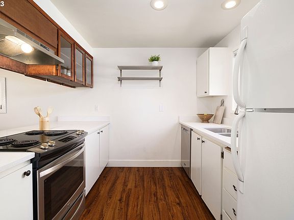 This charming two-story townhome is nestled in the trees and beautiful historic neighborhood of Johns Landing. Minutes from Zupans Market, restaurants, bars, Willamette Park, and the river! Just a few miles to downtown PDX, OHSU, PSU, Lewis & Clark, & NUNM. Easy freeway access. Public transport is conveniently located nearby. Renovated interior is full of character. Includes renovated, spacious bathroom, newer vinyl flooring throughout, and newer linoleum in half-bath & laundry room (on 2nd floor); newer quartz countertops; stainless steel oven/stove, & dishwasher; newer washer and dryer; private, fenced-in patio; balcony; 1-parking space off street and lots of street parking; and plenty of storage including two patio closets and reserved storage space in the basement. This home offers the perfect balance between peaceful neighborhood life and easy access to the hustle & bustle of Portland.