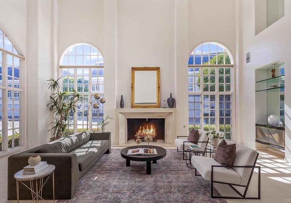 Welcome to this rare and highly coveted corner-unit townhome—one of the few with its own private driveway—in the exclusive, gated community of The Jockey Club, ideally located adjacent to the world-renowned Omni La Costa Resort & Golf Course. Step inside to a truly breathtaking living room, where soaring 20-foot ceilings and dramatic floor-to-ceiling windows flood the space with natural light. A grand fireplace serves as the centerpiece, creating an elegant yet inviting ambiance that’s perfect for upscale entertaining. Just off the main space, a cozy family room offers the perfect retreat for relaxing evenings or hosting guests in a more intimate setting. The gourmet kitchen opens seamlessly to a tranquil, private patio surrounded by lush landscaping—ideal for indoor-outdoor living. With granite countertops, a prep sink, and generous counter space, it’s designed for both style and function. Upstairs, two oversized bedrooms await, including a show-stopping primary suite worthy of a five-star resort. Enjoy room for a sitting area, a spacious walk-thru closet, and a luxurious en-suite bathroom adorned with black-and-white marble, dual vanities, a jetted soaking tub, and a separate shower. Impeccable curb appeal is complemented by mature, manicured landscaping in both the front and back. Community amenities include gated access, a clubhouse, pool and spa, and direct access to the fairways of the Omni La Costa Golf Course. Sophisticated, serene, and simply stunning—this is La Costa living at its finest.