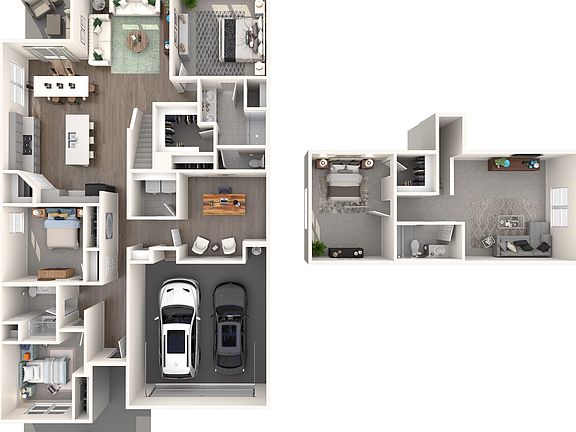 Create a play room or office in the upstairs bonus room. The kitchen is the heart of the open-concept living space. White cabinets with chipped ice quartz countertops, EVP flooring with dark gray tweed carpet come in our Balanced package.