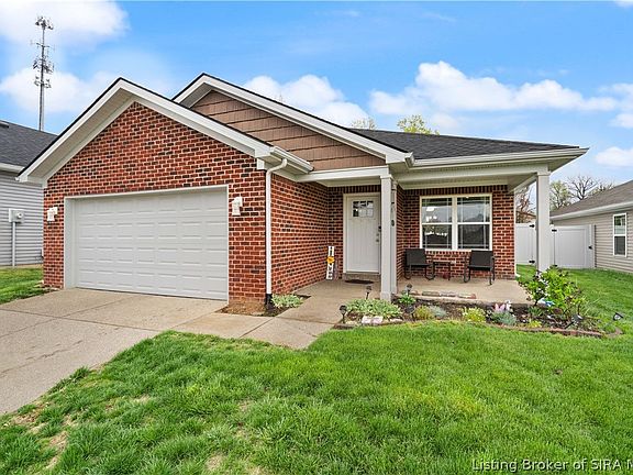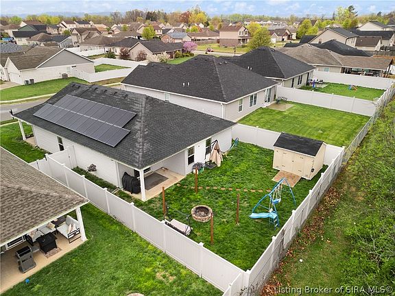 LOCATION and CONVENIENCE are key and this beautiful, NEWER home in SELLERSBURG offers both and a lot more! The main living space features an OPEN FLOOR PLAN with VAULTED CEILING and custom built FIREPLACE/mantle and opens to the spacious eat in kitchen with BREAKFAST BAR and large PANTRY. Split bedroom design includes primary bedroom with large walkin closet and attached ENSUITE, and 2 more large bedrooms and full bath. You will love entertaining in the private, FENCED IN BACKYARD, sitting around the firepit or under the COVERED BACK PORCH. New shed with electric offers a place for storage or space for hobbies, like woodworking. Another key feature of this floor plan is an oversized laundry room (Washer/Dryer stay) leading to attached 2 car garage. Additional updated features are whole house surge protector, NEST thermostat, and auto on/off light switches in some rooms. Solar panels can stay for additional cost-ask agent for further details. Don’t wait, because this home will not last!