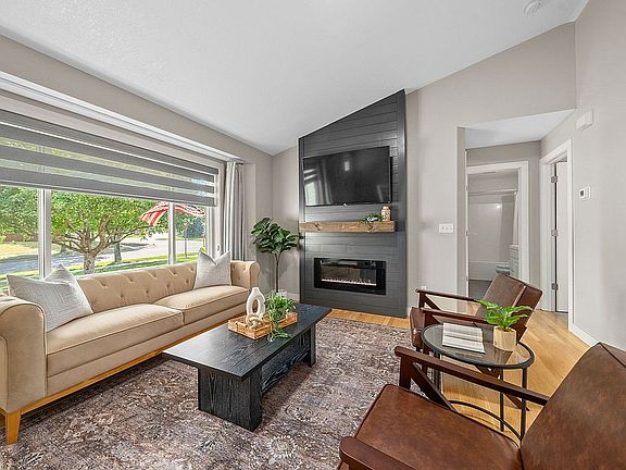 Custom shiplap fireplace surroundCorner lotRefinished hardwood floorsVaulted ceilingsFresh paintMain floor laundryQuartz countertops