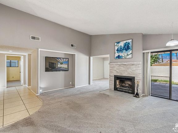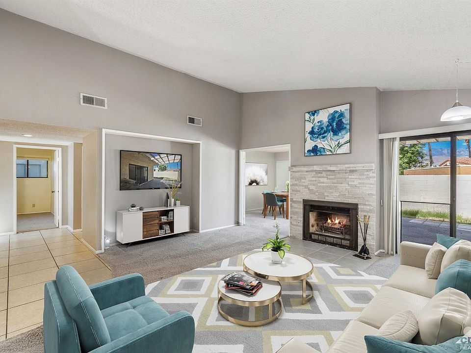 Walking distance to El Paseo. This charming three bedroom condo in Portola Village has 1459 square feet and two baths. The home has had many recent updates, including new stainless steel appliances, new LED lighting an updated bathroom, stacked stone fireplace and 18 inch tile in the main areas and paint throughout. The master bath has separate vanity areas, a large walk in shower and two bedrooms have access to the private patio. Directly across from the pool and tennis courts, it's in the ideal location. The spacious two car garage has plenty of built in storage and direct access to the kitchen. HE washer and dryer on stands and Barbecue hooked directly to gas line are included. Fantastic location, centrally located and close to Hwy 111, shopping and restaurants. And low HOA's.
