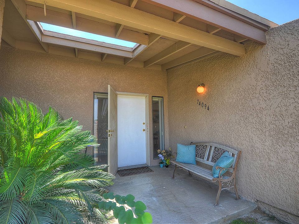 Walk to El Paseo. Great end location and rarely on the market, this free standing very private 1,312 sf single level unit available in Portola del Sol has a large backyard, two bedrooms plus den or third bedroom, master has walk-in closet, two bathrooms and an open floorplan. The kitchen has been completely remodeled with new cabinets, granite counters and new flooring. Vaulted ceilings with floor to ceiling windows in the living room provide plenty of light. This is a Planned Unit Development so you own the land. Portola Del Sol offers a gated community with two pools, tennis courts and a low HOA. Fantastic location, walking distance to Hwy 111 and shopping on El Paseo.
