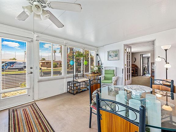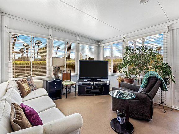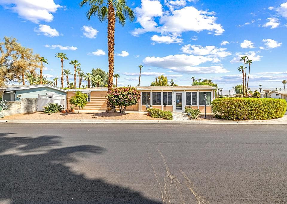 55+ community 2br 2ba on good sized lot. a potential 3 bedroom plus office space too! Spacious ,cheerful sunroom with mountain views, Spacious great room , separate dining room. There's a lot of room in this home to arrange to your wishes. Interior walls have been textured and painted and there is a new floor in the master bath. Patio with view, evaporative cooler, 2 refrigerators, newer water heater and roof, 8x21 shed with workbench. Enjoy the beautifully maiantained 18 hole par 3 golf course. There are so many activities, golf events, pickleball, bocce ball, tennis, swimming (3 pools/spas), dinners, bingo, live entertainment and much more. Dog park too. All for just $379 monthly and close to wonderful shopping and dining Home has 433 foundation. There is also a golf cart! Play golf FREE anytime you want you want! HOA of $379 a month also includes free wifi, cable and trash and golf. Very well located in the heart of Palm Desert