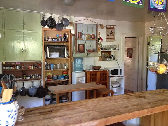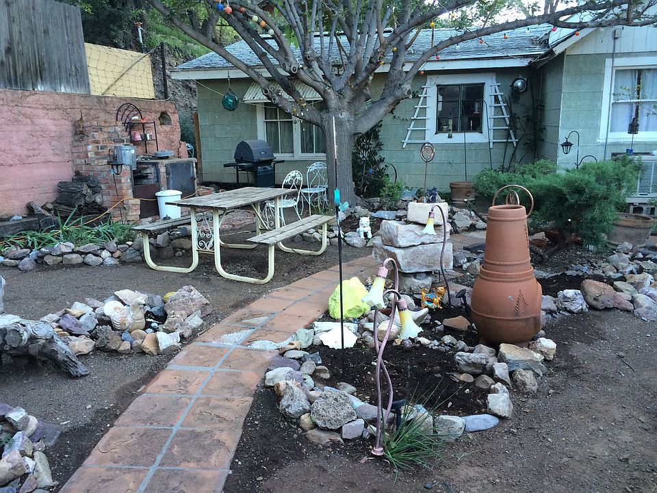 Two buildings, one is my house. The second building is a large two level studio space. No water in the studio space, but accessibility to a sewage connection is underground, readily available. There is lots of parking and no stairs, apart from the studio, which is rear and special in Bisbee. Another special aspect is the total silence of the bedroom. Two buildings are divided by a charming garden, with a large shade tree. The WPA wall has a historic built in oven. (I can tell you more). The property is right off Tombstone Canyon a dead end, walking distance from the center of town.