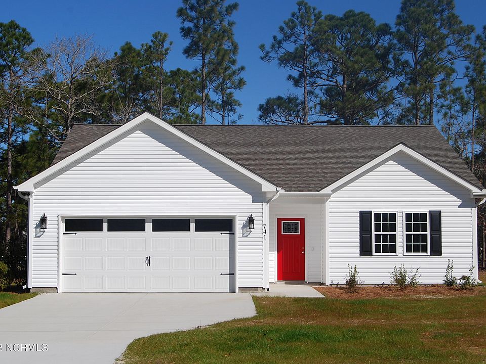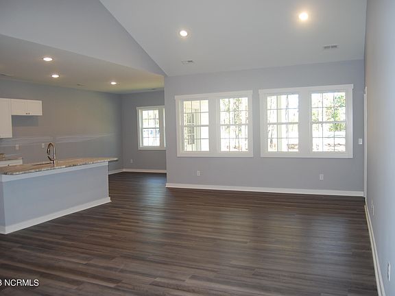 New Construction/Move-In Ready. Oversize lot on the golf course. Quiet cul-de-sac location. Open floor plan with large kitchen island. The vaulted ceiling really opens up this home and the wall of windows over looking the golf course make for the perfect view. Granite countertops in kitchen and baths, soft close doors and drawers, pantry, stainless appliances. Large laundry room with additional storage. Master suite is at the back of the home and offers a huge walk-in closet. Master bath has dual vanities, walk-in shower and linen closet. Two additional bedrooms at the front of the home share a bath. All bedrooms have ceiling fans and 9ft+ ceilings. LVP flooring throughout. Rear covered porch for relaxing and entertaining. True two car garage.