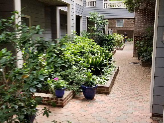 Sun filled corner unit with plantation shutters and wood burning fireplace. Updated bathrooms and new flooring throughout. Updated stainless steel appliances. Master bedroom has 2 walk-in closets. Custom built-ins. Large utility room with washer and dryer in unit and also additional storage space on 4th floor. Garage parking, elevator and secluded pool area. Rare beautiful setting with mature trees and landscaping near Fletcher Park. Minutes from The Village District. Small dog is negotiable. water charge included in HOA fee/owner pays