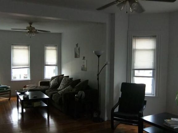 2 Bedroom. 1 bath in a mixed use building. Living room, dining room. On street parking. Wood floors, Carpeting. 1 year lease.}