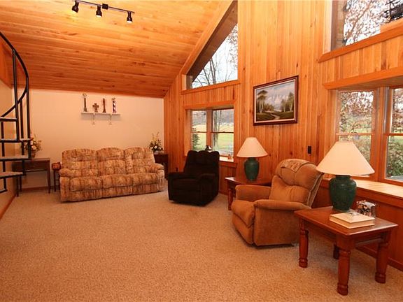 Rustic cedar & Stone Mountain home only minutes from Turnpike, Hidden Valley & 7 Springs Resorts! Tucked back the private paved drive sits this spacious home with detached garage and 2 sheds. Beautiful woodwork throughout the home including family rooms with cathedral ceilings. Features include freshly painted inside and out, wood burning stone fireplace in dining/great room, master bedroom suite, updated bathroom, oversized loft and more. The partially finished basement makes for a cozy atmosphere, while the other side offers ample storage space. This home offers lots of sleeping space with 4 bedrooms and don't forget about the bonus loft. Rooms could also be used as an office or hobby room. The heated, car detached garage is any car lover's dream with a workshop and space above for your hobbies! One shed is also heated, plus you have the swimming pool!