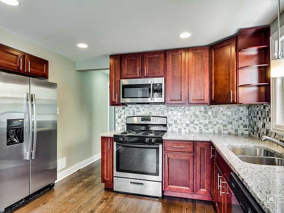 Incredible Updated 5 bedroom 2 bath Ranch with much attention to detail. Gleaming new hardwood flooring throughout main level. Flow room to room with nice warm colors, white chair rail and detailed trim work make for a clean finish in every room. LR & DR are separate which is a PLUS Eat In kitchen boasts SS appliances, granite counter tops 42 " cabinets, incredible tiled back splash, & cute side shelving next to each window. The bedrooms are a nice size and each has its own ceiling fan. Much more space in the fully finished basement with a Family Room, 2 additional bedrooms full bath and laundry room. PLUS a NEW 2 car garage.