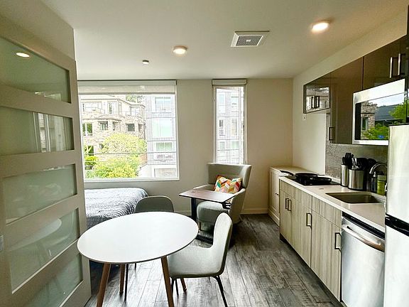 This unit is a bright studio apartment with large east-facing windows. Your new home features a murphy bed, kitchenette with modern finishes, in-unit laundry, and plank flooring! This apartment comes fully furnished with toiletries, complete bedding and cooking set.