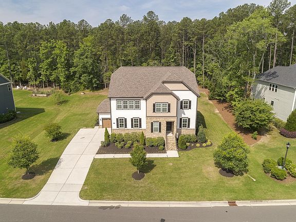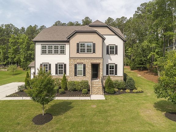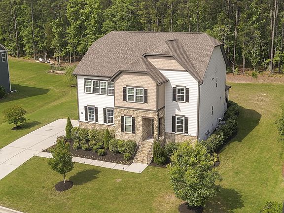 Rare find in sought after Peninsula at Amberly. Outstanding home that shows beautifully. Lovingly kept and gently used, as good as new. East facing house that sits on .51 acres wooded lot backing/easy access to American Tobacco Trail. Open floorplan with Gourmet Kitchen. Entertainers paradise with endless counter space and Sun room for abundance of natural light. Relax in the Master Bath, featuring Soaking tub/Dual Vanities/Over sized shower. Each room comes with it's own attached bathroom. First Floor Guest Suite. This house has it all.