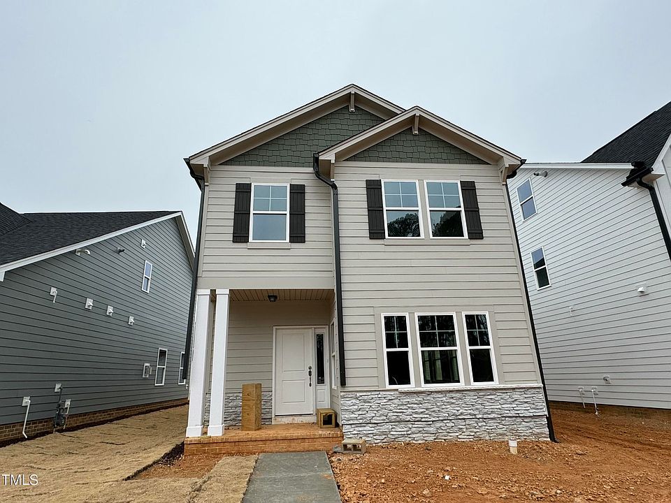 The Cypress floor plan offers a perfect blend of modern amenities and stylish design, creating a comfortable and inviting home. The entrance features a charming front patio, ideal for enjoying morning coffee or relaxing in the evening. Upon entering, you'll find a convenient powder room on the first floor, perfect for guests. The open-concept living and dining area seamlessly connects, providing a spacious and versatile space for family gatherings and entertaining. The kitchen is a culinary delight with a large walk-in pantry, offering ample storage for all your kitchen essentials. The home also includes a detached garage, providing secure parking and additional storage options. Upstairs, the primary suite is a true retreat, featuring dual sinks, a walk-in shower, and dual walk-in closets. The two secondary bedrooms, also located on the second floor, provide comfortable accommodations for family members or guests. The Cypress floor plan combines functionality with elegant design, making it an excellent choice for those seeking a modern and convenient living space. Paddington Station is a part of the extremely sought after neighborhood of Knightdale Station- a 5 minute walk to Knightdale Station Park which boasts amazing amenities! Public access to dog park, splash pad, playground, walking trails park, and walking distance to delicious local restaurants & nightlife. This community has it all!