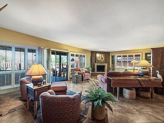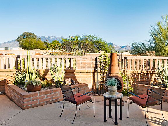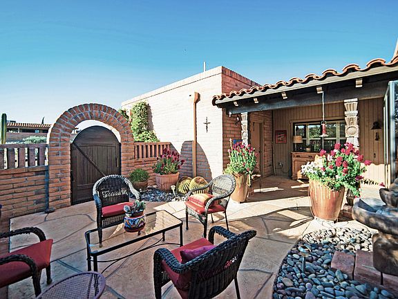 Red brick construction, curved wall architecture and a stamped flagstone walkway takes through an archtop gateway with rustic wooden gate to a private courtyard. A cleverly designed Miramar model, you'll enter into an open living and dining area with diagonally set earth tone floor tile directing your attention to the angled corner fireplace. The reconfigured kitchen features stainless appliances including dual wall ovens and electric cooktop, granite countertops and abundant cabinetry. For casual meals the spacious dining nook provides courtyard patio views and sliding doors lead to the wrap around patio. The large master suite provides patio access and the master bath has a glass block and custom tiled shower and a dual sink vanity with artisan bowl basins, and stylish plumbing fixtures, lighting and mirrors. Your visitors will love the beautiful guest suite with its own private patio too. This terrific home has a super private location and oversized back patio with numerous sitting areas, including a sunken firepit area with bench seating. You'll have many evenings under the star filled sky while creating wonderful memories with family and friends.