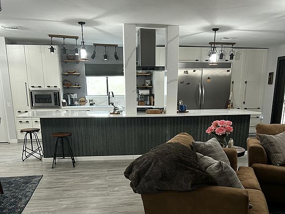 Do you wish you had more space? How about a 1172 sqft garage attached to 1709 sqft home. With an entertainment area that is truly unique. Grain bin tops the patio setting with plenty of room to have your guests lounge or dine, accessory cooking area with sink and counters. Uncovered patio perfect for the hot tub and sunbathing. 1/2 bath close by for convenience. Next to the garage is a flat area for additional parking or building. NO AGE RESTRICTION - NO HOA - 1.24 acres. Inside is where rustic meets simple elegance with corner fireplace and great room styling. Enter through iron hinged, dbl pane window, security bar decorative doors. A grande center 44''x177'' island of quartz, gourmet Fisher & Paykel 5 burner gas range. Airdraft range hood with light, filter, alarm. Large Frigidaire sub-zero Gallery 66'' refrigerator. Convection microwave, newer Kitchenaid dishwasher. Custom cabinets and drawers with oversized handles. Large pantry cabinets on each end of kitchen. Mesquite custom shelving and custom lighting.