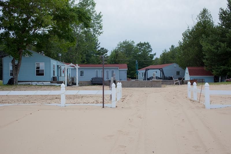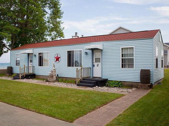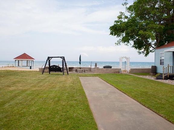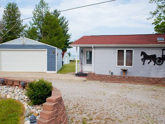 This charming house sits on 100 feet of sugary sand Lake Huron beach! There's a main 2 bedroom 1.5 bathroom that is 1317 sqft and then there's two, 2 bedroom 1 bath cottages that are 416 sqft each! This would make a great vacation rental as an income property or a large family compound! So many options with this beautiful property. There's a 2 car detached garage for parking or for your toys. There's also a shed in the back yard for additional storage. The lake side yard is perfect for entertaining, comes with a shuffle board, a concrete picnic area and seawall which leads out to the sandy beach where you'll find a cute gazebo by the lake. The wall furnaces in the cottages and the furnace in the house were installed in 2018. The roof was new in January of 2021 and the main house was replumbed in 2023.