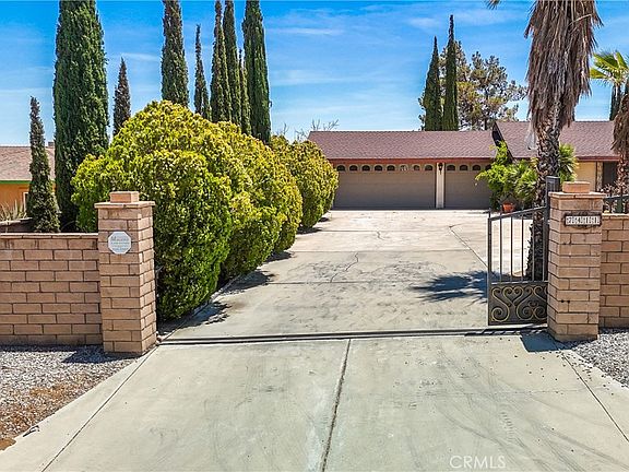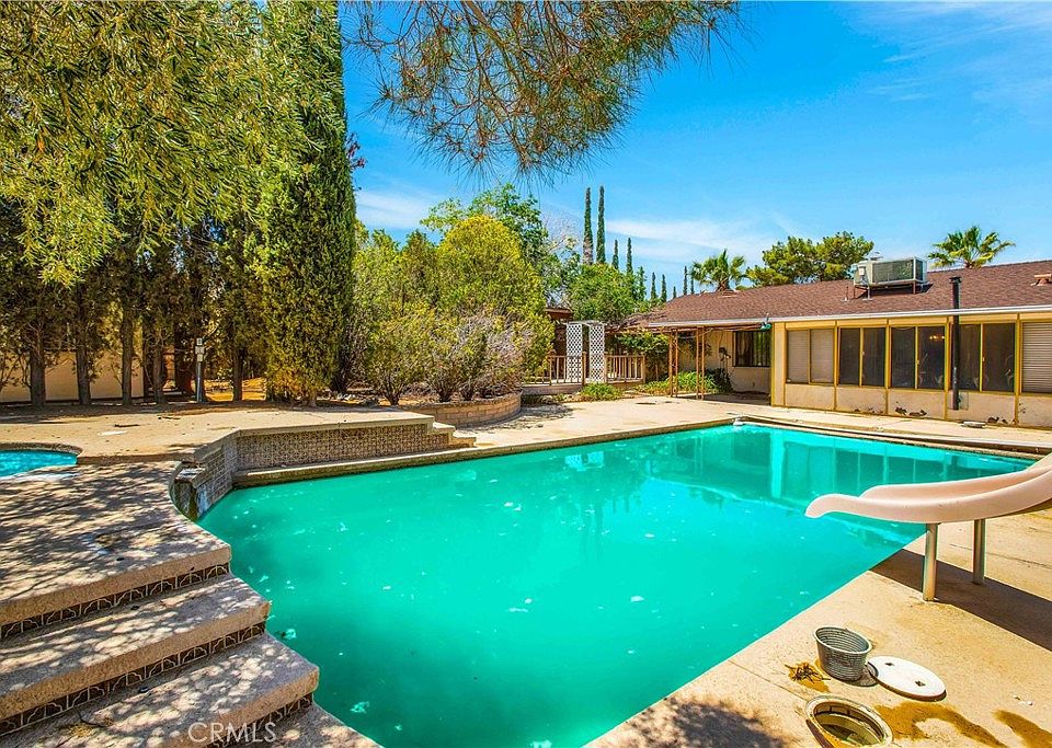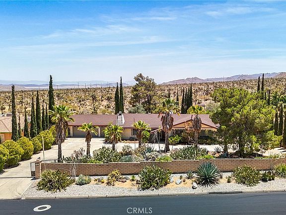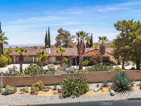 Welcome to your dream oasis in the heart of Yucca Valley! This delightful 3-bedroom, 2-bathroom POOL HOME, nestled on nearly 1/2 acre in the prestigious Western Hills Ranchos, offers a perfect blend of comfort, space, and potential. Located on a paved road, the property boasts a concrete driveway and luxuriant landscaping that sets the stage for the exceptional features within. As you approach the home, you'll be greeted by a covered front entry adorned with a charming wrought iron gate and an impressive wooden front door. Step inside to discover a spacious living room featuring a stunning stone hearth gas fireplace and a wooden storage insert, creating a cozy ambiance for family gatherings. The large, open dining room connects to the kitchen, making it ideal for entertaining. The kitchen itself boasts tile counters and floors, and an abundance of wooden cabinetry providing ample storage space. Meanwhile, the laundry room continues the theme with additional tile counters and flooring, ensuring functionality and convenience. This home offers an attached 3-car garage, providing plenty of space for vehicles and storage. The hallway is lined with ample storage options, ensuring that everything has its place. The two well-lit guest bedrooms feature generous closet space, perfect for family or guests. The retro pink-tiled guest bath, complete with a tub/shower combo, adds a touch of vintage charm. The expansive primary bedroom is a true retreat, offering extensive closet space and an en-suite bathroom. The bathroom is designed with a large vanity, dual sinks, a separate commode and shower room, ensuring privacy and convenience. Step outside to discover a bonus enclosed sun porch area, perfect for enjoying the beautiful desert sunsets. The covered back patio overlooks a huge backyard oasis featuring a raised entertainment deck, mature landscaping, a beautiful IN-GROUND POOL, a small pomegranate orchard, and ample outdoor living space for relaxation and recreation. While this home is already brimming with character and charm, it presents an incredible opportunity for personalization with just a little TLC to modernize its look. Imagine the potential to create your perfect desert haven, tailored to your unique style and needs. Don't miss your chance to own this captivating pool home in Western Hills Ranchos. Schedule a showing to start envisioning the possibilities!