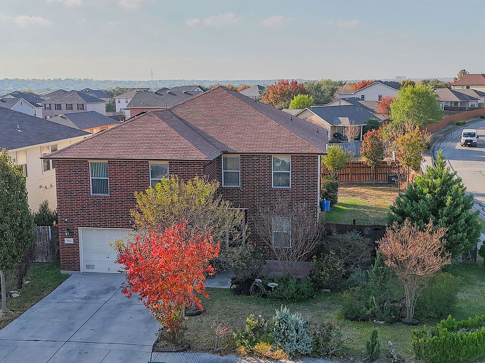 Just minutes from Randolph Air Force Base and the Forum shopping center! This well maintained 4-bedroom, 2.5-bath home sits on a large corner lot, backing up to a greenbelt. Where thoughtful upgrades meet comfort. Upon entry, an open-concept living area welcomes you with hardwood flooring and tile throughout. The kitchen has been renovated to include granite counters, 6 in backsplash, a new large peninsula counter accommodating 6 seating spaces, and an XL sink. All bathrooms have also been upgraded with new tile and sinks. Both AC units recently replaced in June & September 2025. Outside, a serene and shady backyard features two beautiful private patios for outdoor gatherings, surrounded by landscaped beauty both in front and backyards, and also boasts a sprinkler system for easy maintenance. New gutters around the home and new Solar Power system ($50K provide tremendous energy efficiency and savings (average bill = $15/month). Upstairs, four comfortable bedrooms with generous windows offer versatility for various needs. The primary bedroom features a large sitting (16 ft. x 13 ft.) area easily converted to a 5th-bedroom, providing extra space for relaxation and comfort. Additionally, there is a flex room (6th bedroom/office downstairs, and a large loft/playroom upstairs. New Vivint Security System with 6 cameras (2 4k cameras) with 360 view, sensors for all windows and doors on 1st floor, glass-break sensors, and floor sensors. This home is 2 miles/5 minutes away from Randolph AFB, I-10, and I-35 making commuting a breeze! In essence, this home is a harmonious blend of luxurious living and tranquility, enhanced by upgrades and outdoor allure.