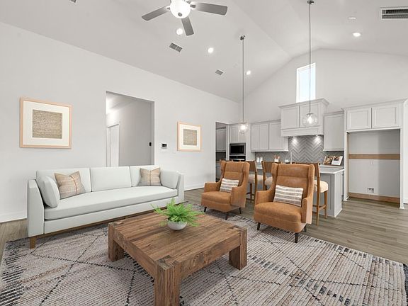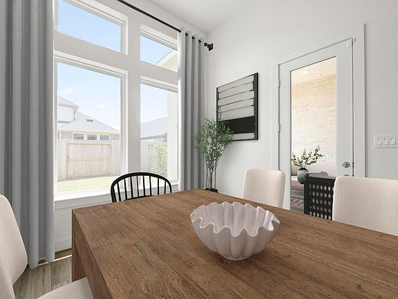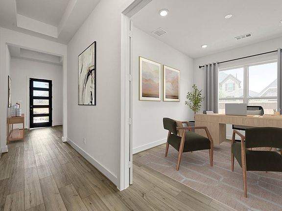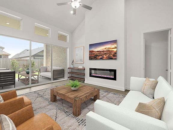 This Bandera Transitional, single-story home is nestled on a corner home site with an upgraded front door that adds to the curb appeal. The elongated foyer is enhanced with 12-foot tray ceilings and a short hall that leads you to two spacious bedrooms and a shared hall bath. The home office features double glass doors for added privacy while handling family business matters. The open great room boasts a contemporary 60" linear fireplace that adds ambiance to any occasion. Open the multi-slide doors to the covered patio to expand your living and entertaining space to the outdoors. The gourmet kitchen comes complete with a center island, a convenient butler's pantry, a walk-in pantry, and a casual dining area. Both the great room and kitchen are connected by a dramatic cathedral ceiling, giving the space an open and airy feel. A stunning primary bedroom suite offers a decorative tray ceiling and full bath with dual vanities, a separate tub and shower, a linen closet, and a sizable walk-in closet. Come see this amazing home today. Disclaimer: Photos are images only and should not be relied upon to confirm applicable features.