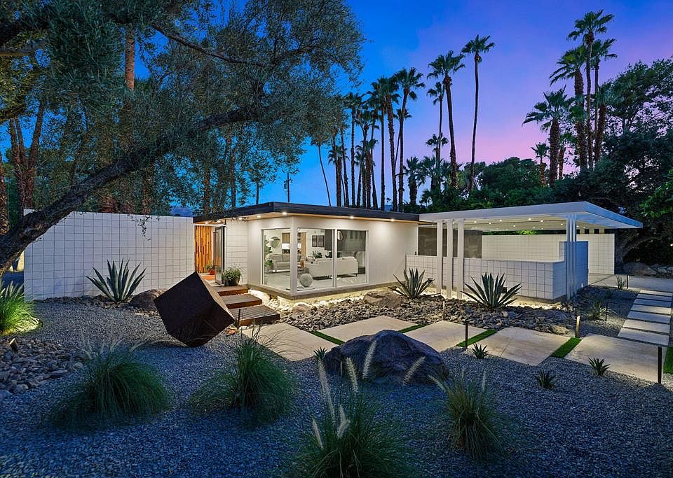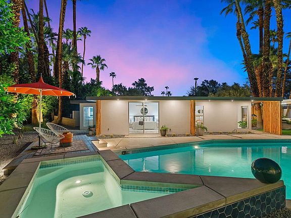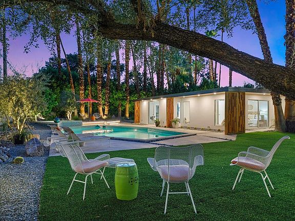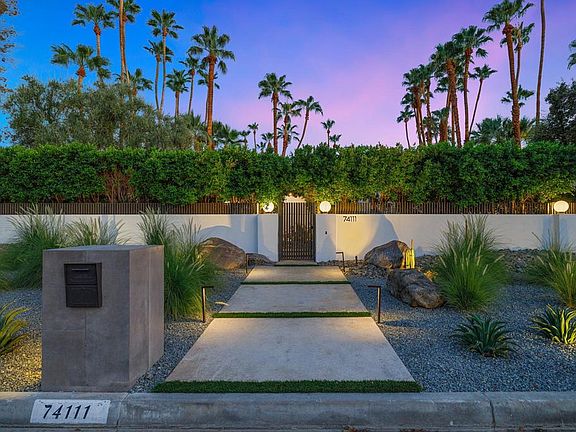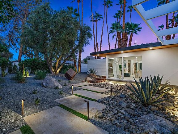 Architecturally significant and sitting on just under a half acre. Only a 5-minute walk to world-renowned El Paseo shopping district. This fully gated compound in South Palm Desert was reimagined by award winning architect Charles Austin of Configure 8 Studio. The 1960 mid-century integrity was kept intact while redesigning the living space to accommodate modern lifestyles. This cantilevered home displays architectural lines that are indispensable treasures of modernism and marveled at in mid-century architectural magazines. The courtyard features a custom-built terrazzo tiled infinity water fountain juxtaposed against mid-century brickwork and a handcrafted artistic wood wall that leads you into the spacious living room. Natural light and windows are ubiquitous, showing off the exquisite tongue & groove and vibrant landscape. Each oversized bedroom is an ensuite with a private patio and sliding glass door. High end finishes from top to bottom - commercial grade doors, floating venetian plastered fireplace, Italian agglomerate marble countertops, terrazzo floors with white oak wire-brushed hardwood in each bedroom, custom cabinets, upgraded Dacor appliance package with a Subzero refrigerator, custom LED strips & landscape lighting--too many upgrades to list. The industrial steel beamed pergola with outdoor kitchen sits beside mature foliage, carefully arranged art installations, decorative wood, custom lighting, and a huge re-plastered pool--with iAquaLink pool automation.