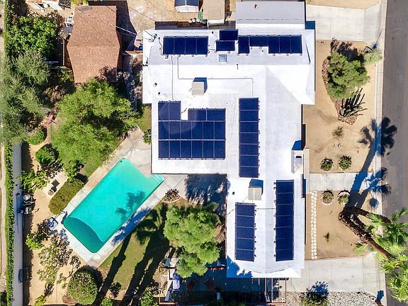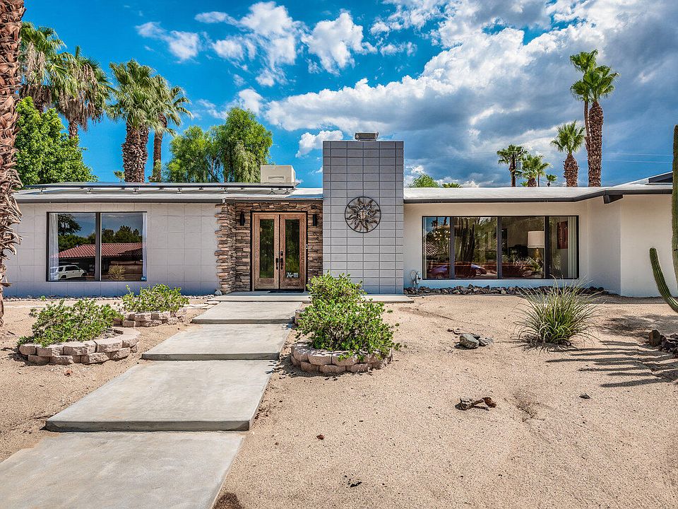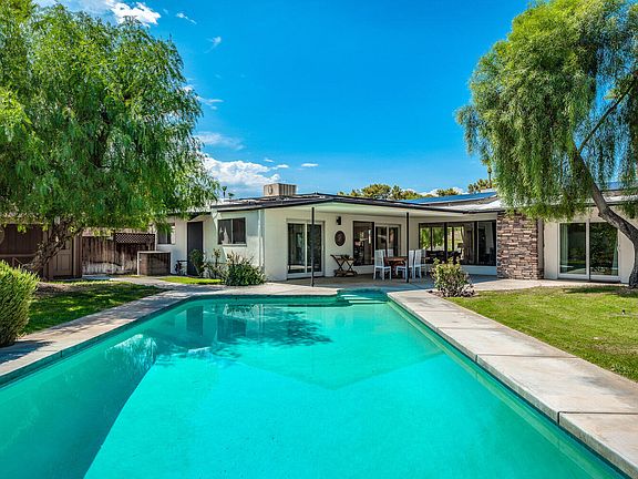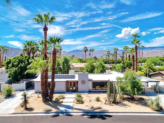 Mid-century Ranch in a conveniently located quiet corner of South Palm Desert. The spacious open floor plan with flexible living room and family room areas is flooded with natural light from both sides of the home. Walls of windows frame views of the mature desert landscaping in the front, covered patio and pool area with partial mountain views. Large back yard with fruit trees, several plumeria trees, lawn areas and workshop shed. Dining room features a buffet with built-in wine and beverage refrigerators. Primary bedroom with ensuite bath and dressing area. Flexible 3rd bedroom with built-in desk and murphy bed. Solar panels with power purchase agreement through Vivint help to keep this home's utilities efficient and affordable. Within the boundaries of the Washington Charter Elementary School, minutes to El Paseo shops and the Living Desert zoo! Total sqft does not include approx. 400sqft family room garage conversion by a prior owner. Buyer to verify.