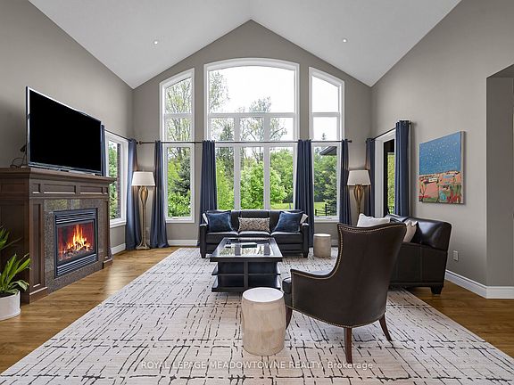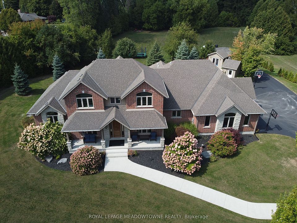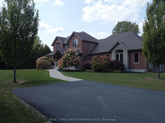 Unbeatable Location! This rare and stunning 1.66-acre property offers the perfect blend of privacy and convenience, just minutes from all amenities and the 401. Nestled at the end of a mature, welcoming cul-de-sac, this 2014 custom-built, 3+1-bedroom, 4-bathroom stone and brick bungaloft features more than 4500 sq ft of thoughtfully designed living space. Designed with family living in mind, this home boasts a spacious open-concept floor plan, with cathedral, vaulted and 9+ ft ceilings and expansive windows that flood the interior with natural light, showcasing the breathtaking views of the private, serene landscape. The main floor offers a "foodie's" granite counter kitchen accented with elegant cabinets and a massive central island. The walk out to the backyard oasis and covered deck provides stunning views. The main floor also offers a principal bedroom with a large walk-in closet and a luxurious 5 pc ensuite bathroom, a formal dining room, walk-in pantry, laundry and a dedicated office space, all designed for today's lifestyle. The finished walk-out basement adds even more value with oversized windows, 4th bedroom, a wet bar, a games & media area, a recreation room with a warming fireplace, and additional storage or potential for future expansion with a separate staircase directly from the garage. Step outside into the ultimate backyard retreat, complete with a fully fenced inground heated swimming pool (2016), a cabana, a cover deck, a hot tub and luxurious Tobermony stone landscaped patios perfect for relaxing and entertaining. Extensive, easy-to-maintain landscaping surrounds this house. This home offers practical functionality with a 3-car garage providing convenient main floor and basement accesses, including a paved driveway with 10+ car parking for family and guests. Move-in-ready homes like this, offering such a unique combination of space, style, and privacy, are truly a gem. Do not miss the opportunity to make this beautiful property your forever home.