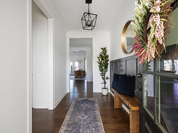 Welcome to this stunning 5-bedroom, 4-bathroom home in the highly sought-after McDaniel Estates in College Grove, TN. With a beautiful white painted brick exterior, this like-new home offers an open floor plan designed for modern living. Inside, the kitchen boasts quartz countertops, double ovens, a gas range, and stylish finishes. The living and dining room feature soaring vaulted ceilings and large windows, creating an airy, inviting space. Hardwoods flow throughout the main floor, which includes two bedrooms—one a guest room currently used as an office with custom built-ins and a charming window seat. The well-appointed laundry room includes custom cabinetry, shelving, and a sink stub-out. The primary suite is a true retreat, with a spacious spa-like bathroom and tile-surround shower. Upstairs, three more spacious bedrooms and two beautifully upgraded bathrooms, one en-suite, with large vanity and tile surround bath, the other with double sinks and tile surround bath. All bedrooms feature large walk-in closets. A huge bonus room with custom built-ins and walk-in storage provides flexible space for work or play. French doors lead to a covered back porch and extended paver patio, perfect for entertaining. The large, flat backyard is fully fenced and beautifully landscaped. McDaniel Estates offers incredible amenities, including a clubhouse, fitness center, pool, dog park, playgrounds, walking trails, river access, a movie lawn, fire pit, and a community garden. Zoned for top-rated Williamson County schools, this meticulously maintained home is an exceptional find.