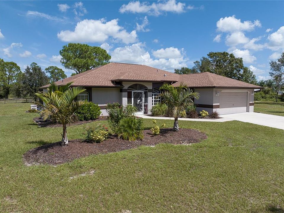 3 Bedroom, 2 Bathroom Pool Home with almost 5 acres of Land and a 4000 Square Foot insulated Steel Building/Barn with office and full bathroom. It features newer style custom cabinets with exotic granite countertops in both bathrooms and the kitchen. The many recent upgrades include a new roof with 30 year dimensional shingles, new Whole House Reverse Osmosis System, bathroom sinks and faucets, ceiling fans, fresh coat of paint on interior walls and trim, variable speed energy saving pool pump,, re-screened lanai and hurricane shutters. It is conveniently located between Punta Gorda/Port Charlotte and Arcadia, this outstanding property offers buyers a piece of Florida paradise with a resort-like estate. Just shy of 5 acres, this updated pool home offers an additional 4000 square foot insulated Steel building/barn that has unlimited uses. Behind the privacy entry gate you’ll find a landscape of mature native trees which provides a private, park-like atmosphere. Once inside the home you’ll find a spacious open concept living/dining room and kitchen with added breakfast nook. The kitchen has newer style custom cabinets and beautiful exotic granite countertops. The living area has unobstructed views of the spa-like pool, landscape and pastures through the stacking glass sliders that open up to a screened lanai, covered patio and pool. The master bedroom is complete with en-suite bathroom with newer cabinets and granite countertops, walk in closet, walk in shower with bench, and an additional storage closet. The 4,000 square foot steel building has a concrete floor and is fully insulated with roll-up doors on both ends. This building measures 80’x40’ with an additional attached side barn that measures 40’x20’. Inside the main steel building is an insulated, air-conditioned office area with a full bathroom as well as a storage loft above. The side barn currently has two high powered exhaust fans installed on the back side, which was previously used as a paint booth. The buildings are equipped with three 220 outlets, water, industrial metal shelving, and plenty of room to add stalls for animals if desired. The three pastures are equipped with sturdy three board pasture fencing and cross-fenced with installed hot wiring to provide security for family and animals. There is also a fenced in chicken coop inside the pasture. All power lines and utilities are underground to provide more reliable service, and receptacles for electric and water can be found all throughout the property-perfect for RV hookups. The location offers a variety of dining, shopping, and business establishments. The Punta Gorda/Port Charlotte area is know for its Florida lifestyle amenities. The Kingsway Golf Course and Country Club is located nearby and is undergoing a complete renovation, and will soon be home to world-class practice facilities, distinctive course design, and modern culinary offerings.