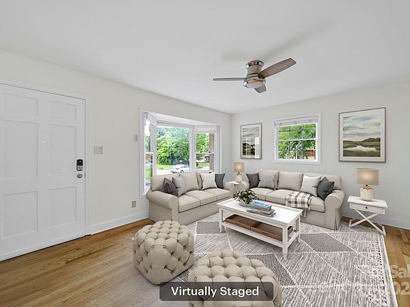 Renovated Starmount Ranch with Rare Garage & Workshop! Bright living room, updated kitchen features a new bay window with built-in seating, granite countertops, tile backsplash, stainless steel appliances (incl. convection oven), roll-out trash, and LVP flooring. Eat-in dining area opens to the living space. Two secondary bedrooms share a full hall bath—one with custom built-in shelving, ideal for an office. Primary bedroom includes private half bath. Flat, fenced backyard with large patio and firepit—perfect for entertaining. Rare detached garage can double as a workshop with 220 V electrical hook up. Hidden in-floor safe adds a fun bonus. Updates: Fresh paint, Roof (2021), HVAC (2023), Water Heater (2023), Garage Door (2022). Walk to Sugar Creek Greenway & Starclaire Rec Club! Don’t miss this unique find in one of Charlotte’s favorite neighborhoods!