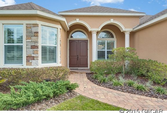 **Under Contract - Backup offers accepted** This luxurious 4/3 has stucco exterior w/decorative stone. Inside enjoy an open floor plan w/clean lines, 10' to 12' tray ceilings, granite countertops, s/s appliances, maple cabinets & travertine floors in luxury master bath, great room, dining, kitchen, office, and all bedrooms. Enjoy his/her closets & brick paver patio. Relax with energy efficient tankless natural gas water heater, vinyl low-e insulated windows, and much more. Lots of natural light. Three-way split bedroom plan offers flexibility and privacy. Walk to community pool or hop on the Archer Braid Trail and ride for miles. Close to Shands/UF. Zoned for great schools and close to Haile Golf and County Club, the Farmer's Market, Celebr
