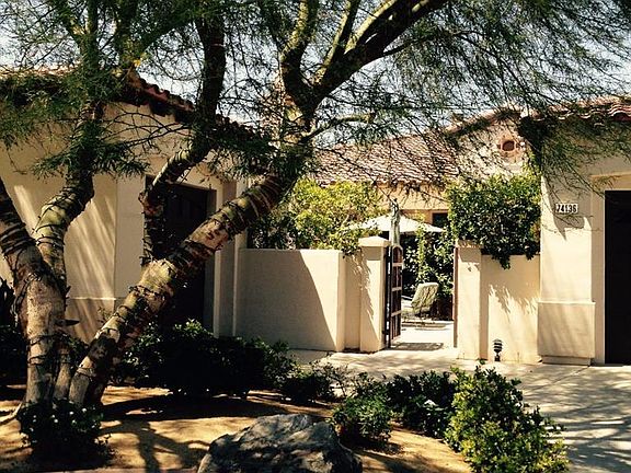 Sensational residence for the discriminating buyer. One of the prettiest homes ever built in the small gated community of Venezia. Magnificent upgrades -- seller has gutted the kitchen and installed all new appliances, cabinets and island with slab granite countertops that have a 'leathered' finish. All standard tile flooring was removed and hardwood floors were installed with 'padding' beneath so that they are easier to walk on. Crown molding, 6 baseboards throughout, and a stone fireplace in the master suite all add to the architectural elements of this fabulous residence. The private courtyard entry also has a fireplace for those chilly desert evenings and this home has a three car garage. Great for a golf cart! Expansive rear yard has an oversized pool and spa with big mountain views. This home has it all -- an old world charm & ambiance with all the modern amenities for a comfortable desert lifestyle. Low HOA dues of $135/mo and in one of the desert's best school districts. Wow!