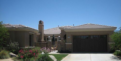 in the gated community of Venezia. Enter the private gated courtyard with its massive stone fireplace & grand archway to the main entrance. Inside find a formal living room with french doors opening to the courtyard, formal dining room, gourmet kitchen with pot filler, slab granite, rich wood cabinets, & breakfast nook. The greatroom floorplan boasts another fireplace, wet bar, media center all opening to the private covered patio with fireplace and saline pool/spa. This home also offers 4BD/4.5BA, approx 3425 SF, ceiling fans and an attached casita with a separate entrance. Located in Central Palm Desert just minutes from fine dining & shopping.