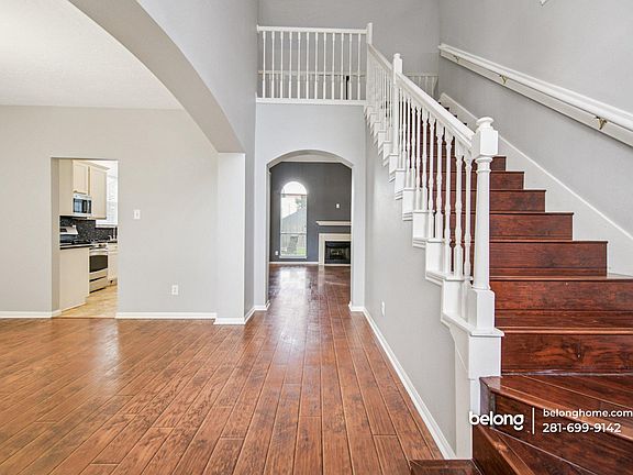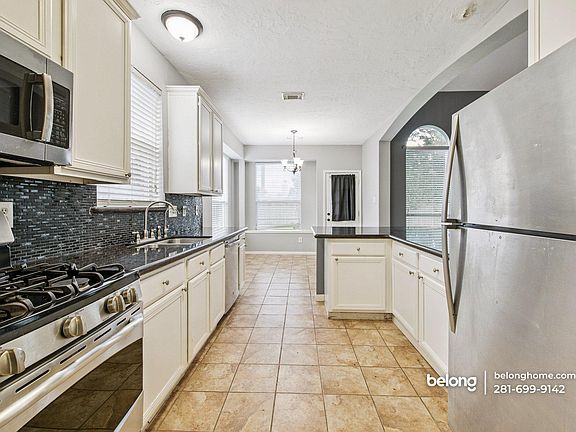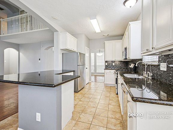 With an airy foyer that welcomes you in and generous natural light throughout, this 4-bedroom, 3.5-bath home in Spring offers the kind of space and layout that makes daily life feel more relaxed. The brick facade, arched windows, and double-height entryway set the tone, while a 2-car garage and large backyard patio add function and flexibility. A water purifying system is also installed for residents to use. Inside, you'll find an open kitchen with abundant cabinetry, sleek black countertops, and stainless steel appliances, all anchored by a spacious peninsula that's great for casual meals. Tile flooring flows through the kitchen and breakfast nook for easy upkeep. The connected living area features soaring ceilings, tall windows, and a fireplace as a central gathering point. You'll appreciate how the layout allows for both quiet corners and open areas to come together and entertain. The main bedroom is comfortably sized with large windows and a ceiling fan to keep things breezy. Its ensuite bath includes a soaking tub, separate glass shower, dual-sink vanity, and a private water closet. The remaining bedrooms are also generously proportioned, giving everyone plenty of room to stretch out. Located in a quiet pocket of Spring, this home is just minutes from Grand Parkway and I-45, offering convenient access to The Woodlands, top-rated schools, H-E-B, and popular parks like Rob Fleming and Burroughs Park. *Fireplace is for decorative use only and cannot be used without consent from Belong. *Our homes come as-is with all essentials in working order. Want upgrades? Request it through the Belong app, and our trusted pros will take care of the rest!