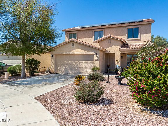 Welcome home! This 4-bedroom, 2.5-bath residence is on a peaceful cul-de-sac! The living room welcomes you with a soothing palette and a harmonious mix of soft carpet and durable tile flooring. The great room is perfect for intimate moments with loved ones. The kitchen features ample white cabinetry, a mosaic tile backsplash, built-in appliances, a convenient pantry, and an island with a breakfast bar for casual dining. The plush main bedroom is complete with a private bathroom and a walk-in closet. Venture outside to the backyard, boasting a covered patio, a charming ramada for outdoor relaxation, and an excellent view of the Community park. Solar panels enhance this home's appeal, blending modern efficiency with comfortable living. See it today!