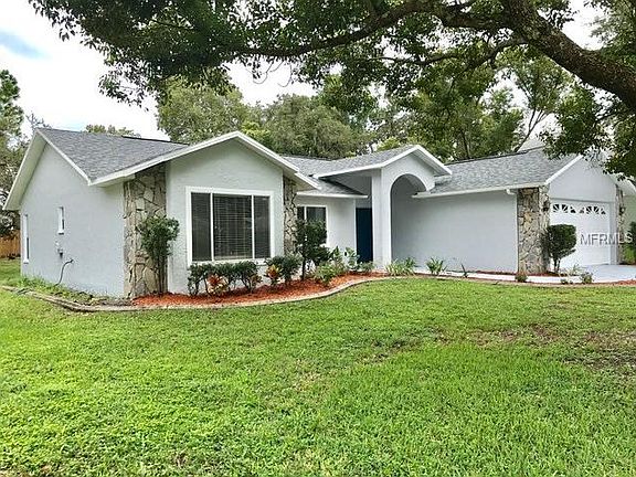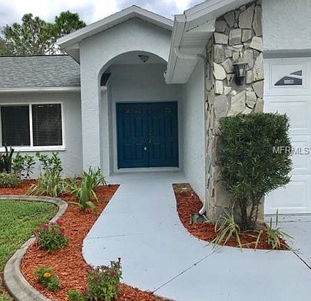 WELCOME TO YOUR STUNNING POOL HOME at 7414 Sheldrake St, New Port Richey, FL. This 3 bed, 2 bath, 2 car garage home is freshly painted inside & out in a warm gray tone. Lawn & pool maintenance is INCLUDED in the rent. Key exterior features are the screened-in pool/lanai, utility shed, tropical landscaping with concrete curbing, rain gutters & huge lot. As you step into the foyer through the double doors, you'll notice the soaring ceilings, laminate floors (no carpet anywhere) & a superb open floor plan. The kitchen has tall wood staggered cabinets with crown molding, accent lighting, travertine backsplash, wine rack, 2 pantries, breakfast bar & deep sink with oiled bronze faucet. The lovely breakfast nook features window seating with additional storage & window treatments. On the other side of the kitchen is the formal dining room with fancy chandelier. Adjacent is the spacious living room with a cool fan & sliding glass doors to the pool. The master bedroom also has sliding glass doors to the lanai. Additionally, the walk-in closet has custom shelving & the private bathroom is a Roman-inspired spa retreat. This bath has travertine tile, elegant solid wood his/her vanities with black granite & crisp white sinks, built-in wall shelf, pendant chandelier & step-in shower with dual rain heads & frameless glass door. The front bedroom has built-in shelving, crown molding & window seat which lends itself to a home office. The other bedroom is nearby along with the bath. Washer/Dryer included & pets welcome.