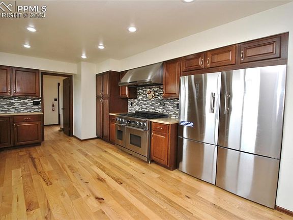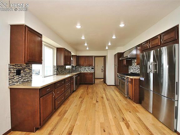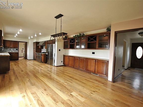 BIG, OPEN, UPDATED, Remodeled Peaceful Valley Rancher. Everything on the inside has been updated and remodeled starting with hardwood floors throughout entryway into huge open kitchen/dining area. Kitchen is accented with Custom cabinets, solid surface countertops, 2 refrigerators, 6 burner commercial grade cooktop stove with pot filler and canned lites throughout. Open vaulted living room with Sangre de Cristo's Mountain views. Luxury master Custom tiled bath plus Custom tiled jetted hall bath. For the fun playground, the lower level has Full Service wet bar and pool table with Theatre area, Game area and a Huge bedroom area plus workout room. Oversized garage plus RV and boat parking, high efficiency furnace, Custom blinds, Restrained deck. Close to Schriever AFB and Peterson AFB. NO detail is spared with every nook Updated!!