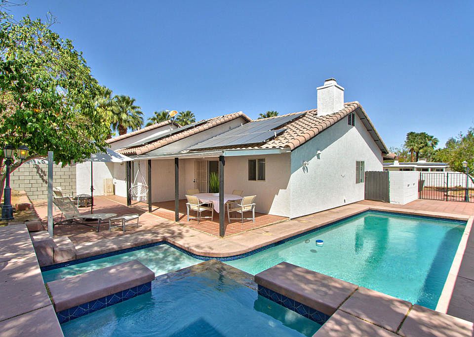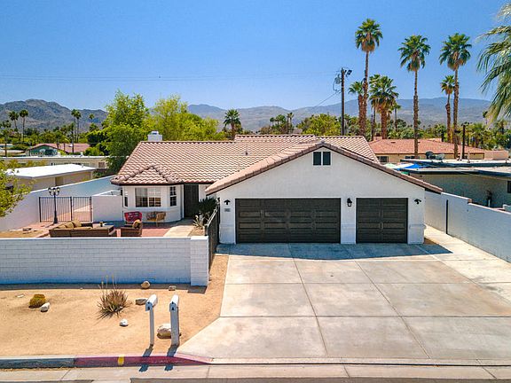 Price Reduced $50,000! Two Homes On A Lot. A Rare Opportunity To Own A Pool Home In South Palm Desert With A Short Term Rental Permit. This upgraded Spanish style pool home features a main residence with 3 bedrooms & 2 bathrooms along with a second home that features a bedroom, living room plus kitchen. With an open floorplan and wood like floors through out, this beautiful home has high ceilings and great natural light. Kitchen and bathroom feature white cabinetry and quartz counters. The wrap around yard features a sparkling pool with tanning deck plus spa. Second smaller home features it's own private yard with a fruit producing guava tree. OWNED SOLAR makes this a great investment. Walking distance to El Paseo Dr, this beautiful property will make the perfect home, second home or vacation rental. Current owner has a vacation rental permit and enjoys use of the second home as his desert getaway. Oversized three car garage has direct access to the main home. No HOA. Call me today to view this wonderful property with a potential 10% cap as a short term rental.