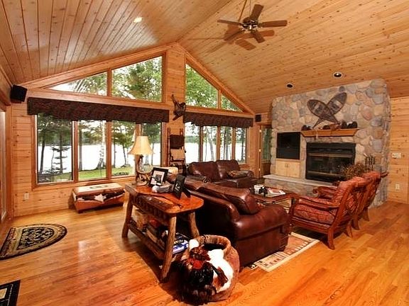Exquisite Eagle River Estate. Secluded peninsula surrounded by beautiful Echo Lake and Sugar Camp creek. The paved drive into the 5+ acre wooded lot leads to privacy with 1,264' of premier frontage on the 5 lake chain. Level approach to sand beach and two piers. Lakeside firepit, patio and 2 decks provide great space for family to enjoy breathtaking panoramic lake views. The cedar sided home offers 4,500+ sqft of living space that has been meticulously maintained. Spacious 3,000 sq ft main floor with lakeside wall of windows. The kitchen offers gorgeous custom cabinets, granite countertops, dry bar and updated appliances. The main floor boasts tongue and groove knotty pine throughout with a wood burning fieldstone fireplace highlighting the great room. 3 large main floor bedrooms, 2 are lake view suites, plus 2 more bedrooms and additional sleeping areas easily accommodate 12! The 3 garages provide 2,828 sqft of storage space for all of the toys!