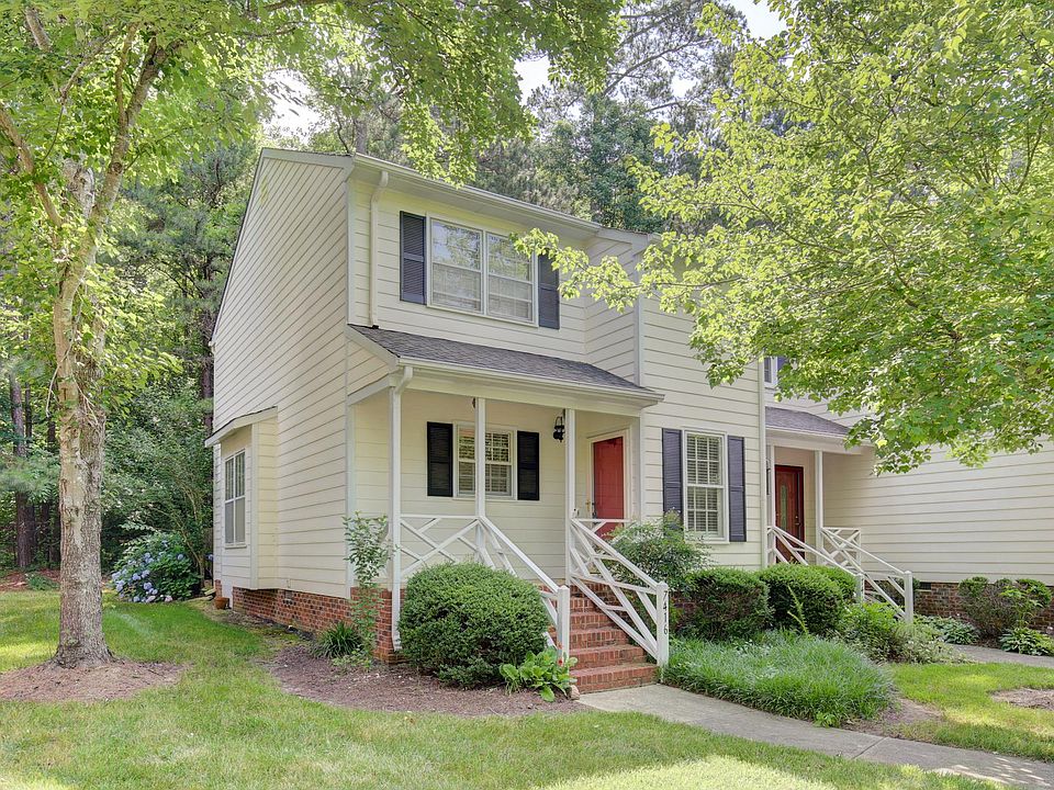End unit townhouse with front porch in great North Raleigh location near North Hills and Whole Foods. This quaint home is surrounded by trees and walking paths. No homes across the street or behind allows for privacy. You'll love the open layout of the main floor with access to private back deck for entertaining. Easily walk to pool and tennis courts at the end of the street. Two well sized bedrooms upstairs each have a full bath and big walk-in closet. Home has been freshly painted, new vinyl flooring installed, and carpets cleaned. Refrigerator and washer/dryer can remain. Ready for you to move right in!
