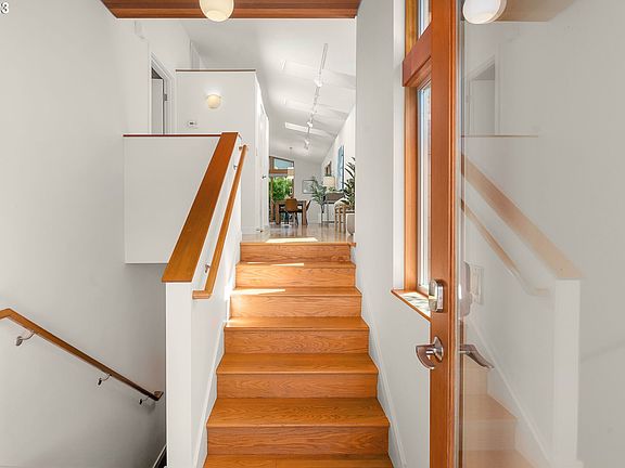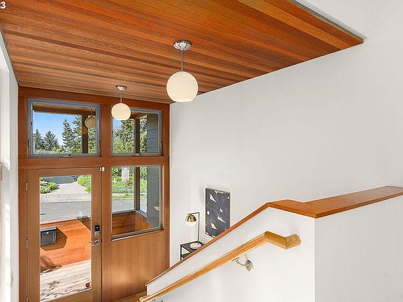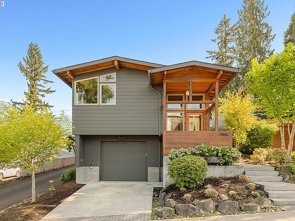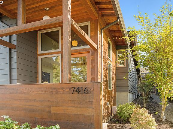Stunning Mt. Tabor Contemporary. Open floor plan with vaulted ceiling's - incredibly energy efficient. The main floor features a large kitchen with SS appliances, quartz countertops & eating nook, light filled living room with views of Mt. Hood, spacious dining room, half bath, & beautiful primary suite with walk-in closet. The lower level consists of a den with built-ins, office area, large bedroom with outside entry, laundry room, full bathroom, tons of storage and attached garage. Outside enjoy the mature landscaping, covered front porch & large backyard patio. OFFER DEADLINE Sunday 5/14 at noon.