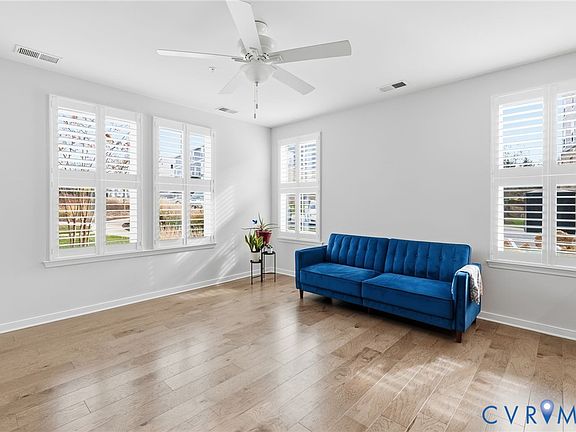 Welcome to this beautifully maintained 3 bedroom ground level end unit in the highly sought-after Cosby High School district, offering extra sunlight throughout thanks to additional windows and timeless plantation shutters on every window. Enter from the covered front stoop into an open great room with engineered hardwood floors, recessed lighting & a ceiling fan. The space flows into a stunning kitchen with quartz countertops, a center island, 42” cabinetry, stainless steel appliances, tile backsplash, pendant lighting & recessed lighting. A convenient half bath and access to the rear-entry garage—where the hot water tank, electrical panel & cable box are located—complete the first level. Upstairs, the spacious primary suite includes two walk-in closets and an ensuite with a tiled walk-in shower, glass door, double quartz vanity & tile floors. Bedroom two features its own walk-in closet, while bedroom three includes a double-door closet and access to the rear balcony with Trex-style decking, outdoor lighting & GFCI outlet. A full hall bath with tile flooring and tub/shower, a linen closet, a laundry closet with stacked washer/dryer & a utility closet housing the American Standard heat pump and Aprilaire damper finish the level. With 3 bedrooms, 2.5 baths, 1,510 sq ft, ground-level entry, generous storage & a prime end-unit location, this home blends comfort, efficiency & modern style in the heart of Chesterfield.