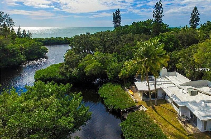 Price reduced for immediate sale! An amazing value for this private, lush tropical oasis on Heron Lagoon. This magnificent 3/4 +/-acre property located inside the gates of The Sanderling Club has southern views of Heron Lagoon and is covered in ancient oaks, palms and specimen plantings. The mid-century modern home includes a 1 BR/1BA separate living quarters if you want to remodel or the land is just perfect for building your dream home. Main house has newer appliances in the open kitchen, a sunroom and screened lanai, a generous master suite with views overlooking the lagoon and pool. Existing dock and davits. Owner has construction plans for a beautiful home with an observation deck allowing Gulf of Mexico views. Enjoy the many splendors of this unique gated private community with its iconic clubhouse, beach cabanas, tennis courts and boat docks.