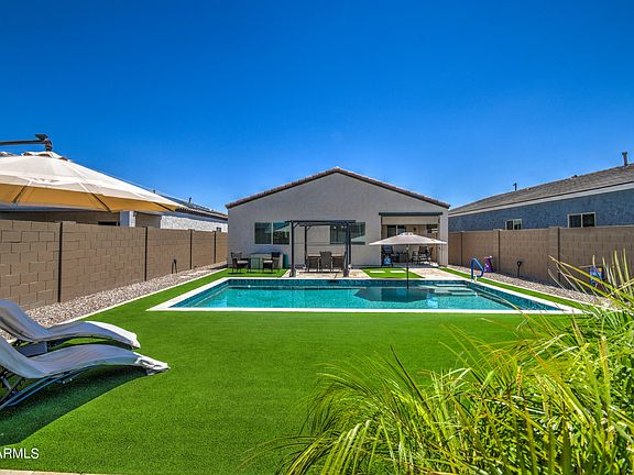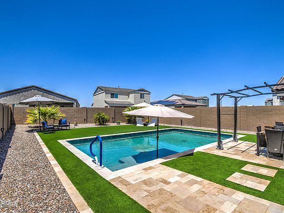 Welcome to your new Home Sweet Home! This 2-year-old, meticulously maintained residence features stunning curb appeal and maintenance-free turf landscaping. Situated on a premium lot with a large backyard, it offers a covered patio and a sparkling swimming pool—very rare for such a new home. Inside, you'll find an open floor plan with a stylish kitchen boasting a breakfast bar, granite countertops, modern light fixtures, a tile backsplash, and ample upgraded cabinets. Enjoy neutral paint and wood-like tile flooring throughout. Plus, it's just 6 minutes to Westgate for shopping, dining, and entertainment. Don't miss out on this gem!