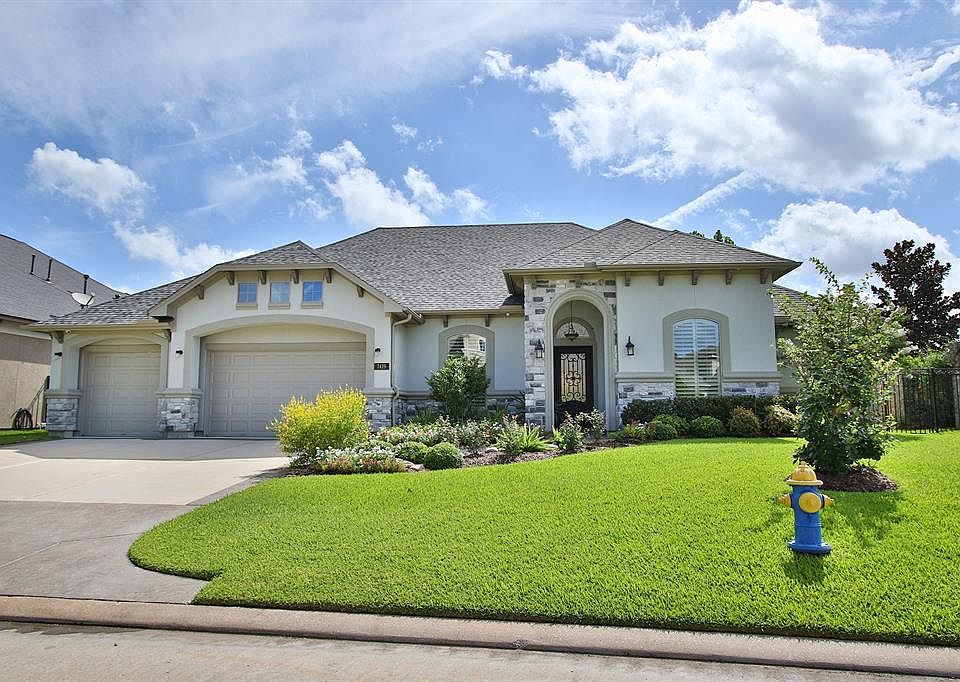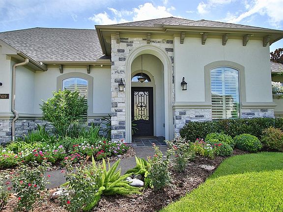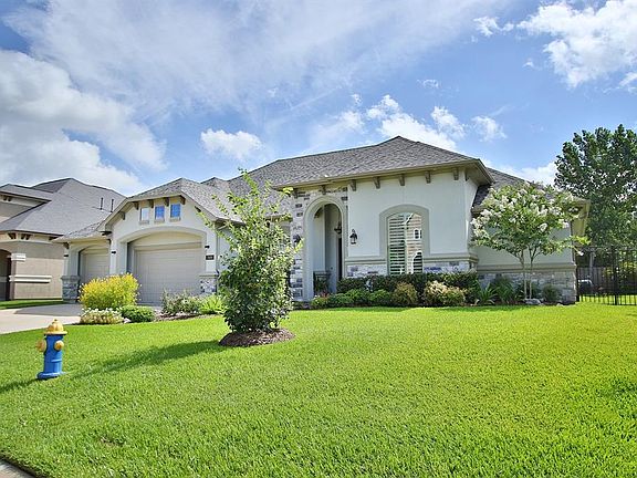 Nearly new, ONE story in a small gated custom home enclave. Quality abounds with these expressions of elegance: Cantera door, both formals, extensive custom millwork, plantation shutters, wine cooler, island prep sink, stone backsplash, gas stove, expansive kitchen, 20' ceilings, 18'' tile, gas fireplaces, spa-like master bath, security cameras, staircase to large Texas basement, outdoor living room at its best, complete with fireplace, outdoor kitchen, fridge, grill & extended pavered patio.