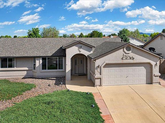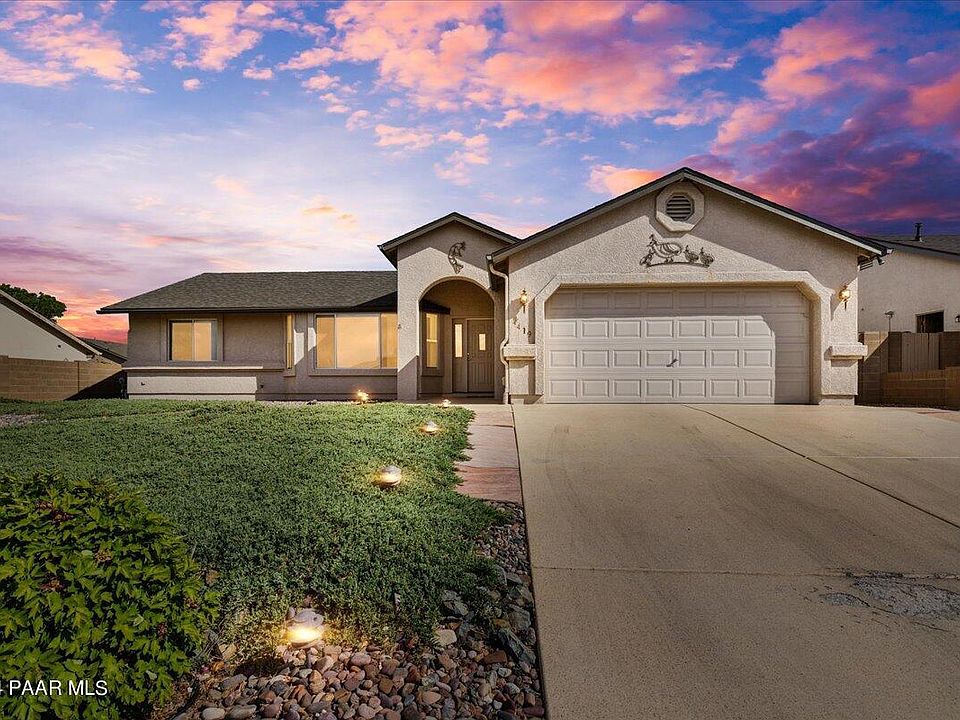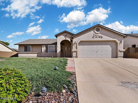 Welcome to this single level home in the Viewpoint neighborhood of Prescott Valley. This stucco ranch-style home has great curb appeal and mature landscaping highlighted by outdoor lighting. An open concept floor plan with the great room inviting you in with vaulted ceilings and large windows, creating a light and airy atmosphere. The kitchen features a large walk-in pantry, and updated kitchen appliances, including a gas range and built-in microwave. A split bedroom plan has the master suite offering a spacious bathroom with dual sinks, a tub/shower combo with a soaking tub, and a walk-in closet. The bedrooms on the opposite side of the home share a full bath with a single vanity. You'll want to spend hours in the 150 sf sunroom with 3 walls of windows and access to the back yard.
