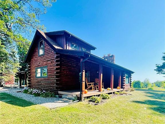 Own the log cabin of your dreams! Come enjoy the country life in this beautiful three bed, 2 bath home. Peaceful front and side porches to enjoy watching the scenery, a large pond, attached two-car garage, and MORE. Lovingly cared for, this house has a full basement with two large areas, efficient geothermal heat, and a pole building plumbed for a bathroom with a shop area and doors. The possibilities for this property are endless. Located in Central Local Schools. Charming log playhouse stays with the home! Don't miss this one--it won't last.