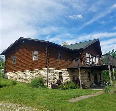 This well constructed log home is nestled on 3.6 acres of manicured property. Home is situated for you to enjoy beautiful sunrises all year long. Huge 36x26 garage with a big second floor could be finished for an office or apartment, built in 2016 Many updates include Erie metal roof that looks like shingles installed 4/14 awesome guarantee, new commercial grade gutters and downspouts 2018, Trane heat pump 4/18, large country kitchen with granite and 4x8 granite kitchen island, granite counters in both full baths, office in huge basement and additional room that could be guest bedroom, views are gorgeous from top of property, large deck off front, beautiful stone fireplace is gas but could be wood burning. Basement has toilet and plumbed for a complete full bath, enclosed 25x11 sunroom in rear, laundry right off master suite on first floor, tons of storage. Everything you need to make this your own spectacular retreat!