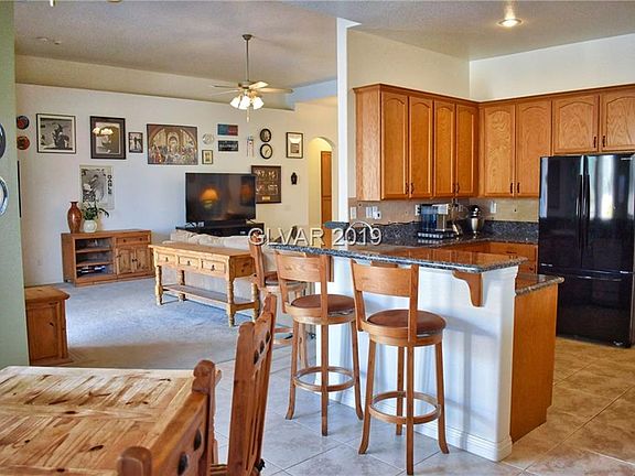 Breathtaking mountain views from this gorgeous home, property & pool! 1,759 sqft offers 3 bed, 2 full bath, high ceilings, & multiple sliding doors that lead to the oversized patio. Kitchen offers granite tops, high backsplash, breakfast bar & eating nook. Master suite boasts 5-piece bath, walk-in closet, & sliding door to patio/pool. RV gate with full hookup, 3-car garage, & storage shed. Close to local amenaties, & approx 1hr to Las Vegas!