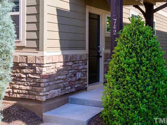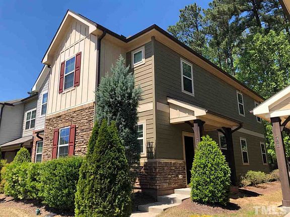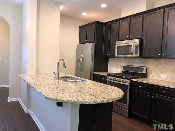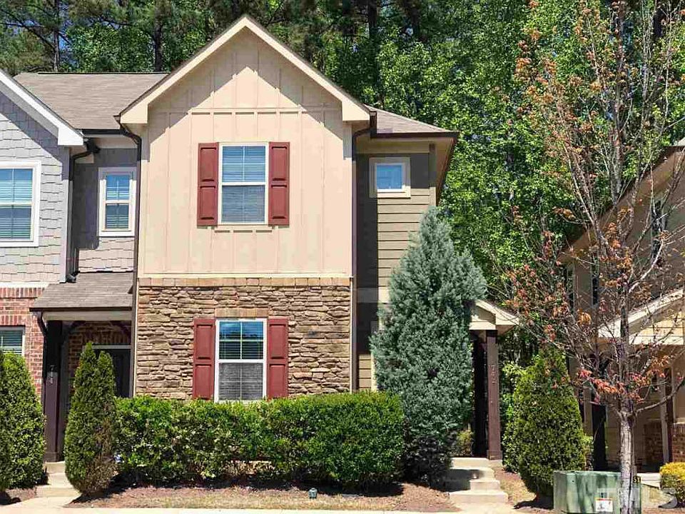 Fantastic end-unit townhome in highly desired Pemberley, Apex community. Close to everything with 4 bedrooms and 3 full baths! One bedroom and full bath on main floor! Bright, open plan featuring wood floors, gas fireplace, kitchen with granite counters, gas range, and pantry. Master retreat has large closet and spa bathroom. Private wooded view from patio. New carpet and paint throughout! Charming neighborhood with pool and playground a block away. Great schools! Vacant and ready for new owner.